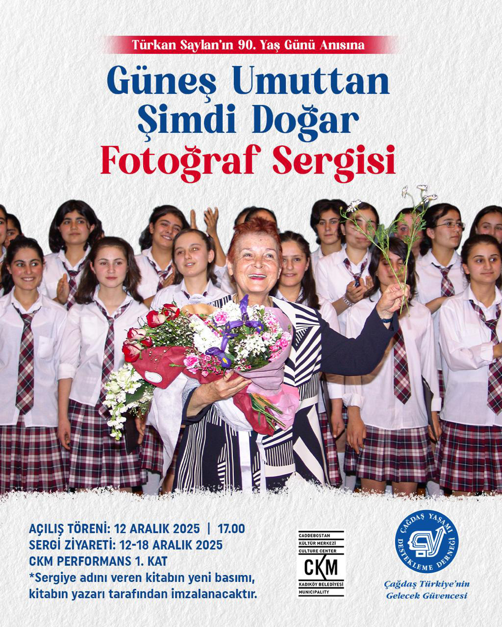 ÇYDD Genel Merkez ve ÇYDD Kadıköy Şubemizin iş birliğiyle, unutulmaz Genel Başkanımız Prof. Dr. Türkan Saylan’ın 90. doğum günü anısına “Güneş Umuttan Şimdi Doğar” adlı fotoğraf sergisi gerçekleştirilecektir.