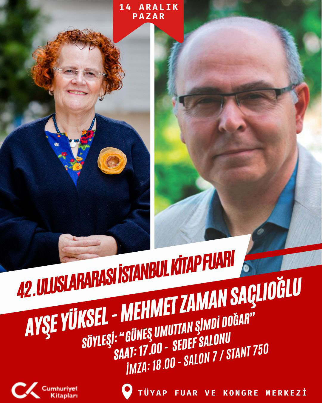 42. Uluslararası İstanbul Kitap Fuarı kapsamında Prof. Dr. Ayşe Yüksel ve ‘Güneş Umuttan Şimdi Doğar’ kitabının yazarı Mehmet Zaman Saçlıoğlu ile bir söyleşi gerçekleştirilecektir. Hepinizi bu özel buluşmaya bekliyoruz.