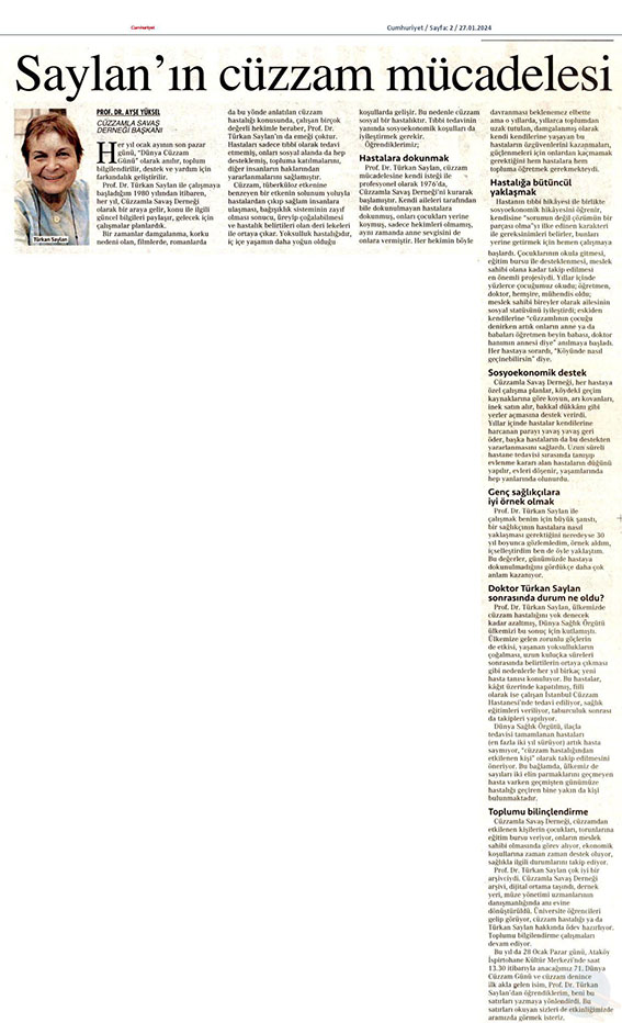"Türkan Saylan'ın Lepralı Hastaların sosyal sorunlarına çözüm bulmaya yönelik kattıklarını" 71. Dünya Cüzzam Günü'nde konuşmak üzere bir araya geldik.